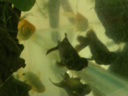 Animated gif of several small aquarium fish (animals), dark and pale gold, swimming among rocks and aquatic plants viewed through the tank glass.