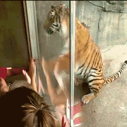 Animated GIF of a tiger (animal) at a glass barrier, pawing and mirroring a visitor's hands pressed against the glass.
