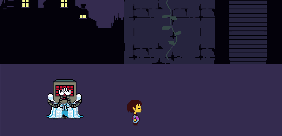 Animated GIF, pixel-art indie game scene (Undertale): a small human protagonist faces a TV-headed enemy against a purple night city backdrop.